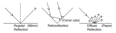 A flat surface, such as glass or a mirror, reflects light at an angle equal to the incident angle of the light. This kind of reflection is called regular reflection. A corner cube takes advantage of this principle by arranging three flat surfaces perpendicular to each other. Light emitted toward a corner cube repeatedly propagates regular reflections and the reflected light ultimately moves straight back toward the emitted light. This is referred to as retro-reflection.