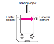 The Emitter and Receiver are installed opposite each other to enable the light from the Emitter to enter the Receiver. When a sensing object passing between the Emitter and Receiver interrupts the emitted light, it reduces the amount of light that enters the Receiver. This reduction in light intensity is used to detect an object.