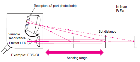 The following figure shows a detection system that uses a 2-part photodiode. The end of the photodiode nearest the case is called the N (near) end and the other end is called the F (far) end. When a sensing object reaches the preset position, the reflected light is concentrated midway between the N end and the F end and the photodiodes at both ends receive an equal amount of light. If the sensing object is closer to the Sensor, then the reflected light is concentrated at the N end. Conversely, the reflected light is concentrated at the F end when the sensing object is located farther than the preset distance. The Sensor calculates the difference between the light intensity at the N end and F end to determine the position of the sensing object.