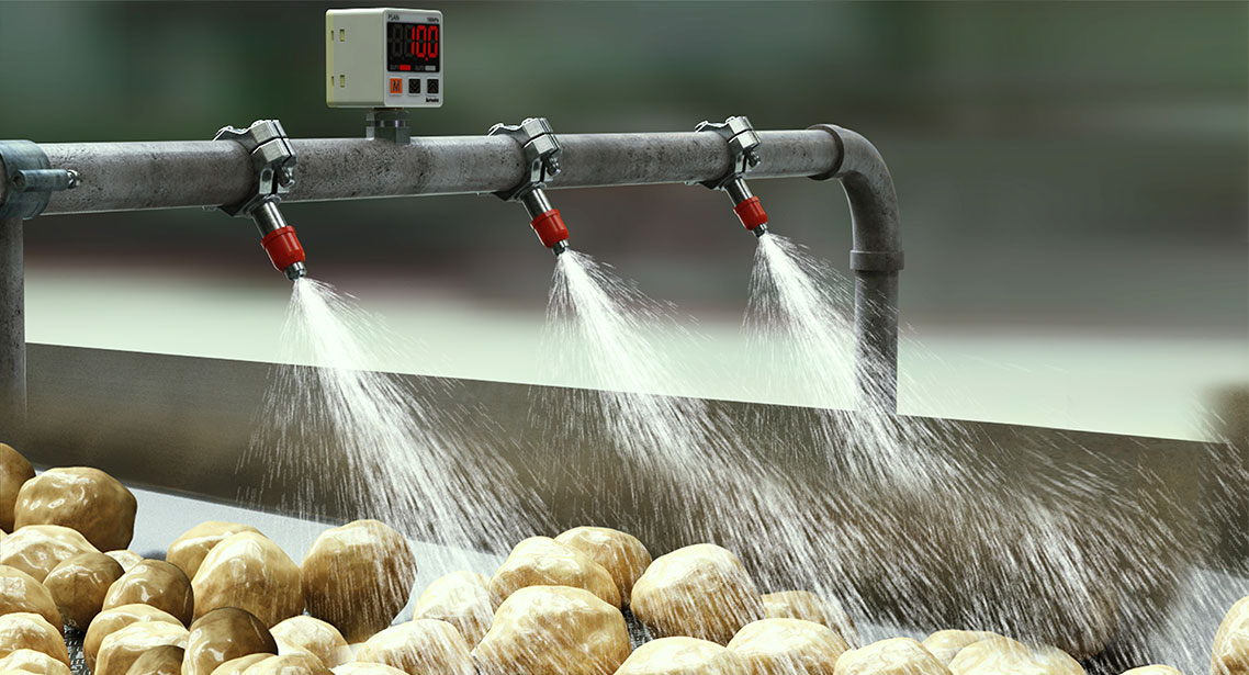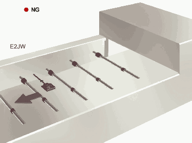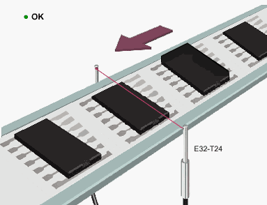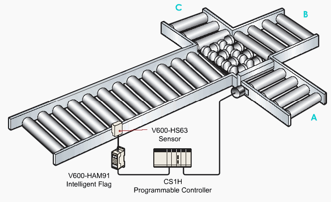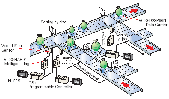 Problems: Beverage production lines where plastic containers, for example, are filled with liquid, have a short tact time and require a high degree of accuracy. The foodstuff industry is subject to particularly stringent levels of product control (e.g., HACCP). Generally speaking, filling control is performed by measuring the weight of the plastic container once in the empty state and then again after the filling has been completed. The difference is calculated to confirm that the weight agrees with the specified value. Data must be exchanged, however, with the host at each measurement, necessitating a complicated system configuration. If, as a result of the inspection, the filling weight is found to disagree with the specified value, correction is necessary. A way of performing the necessary sorting control quickly, simply, without sacrificing reliability is required. Mount ID Tags to the jigs holding the products. If round jigs are used, mount the ID Tags to the bottom of the jigs and install the Antenna underneath to ensure access even if the jigs turn around. Measure the weight of each container in the empty state and write the result to the ID Tag. Write the filling machine number to the ID Tag to distinguish it from machines at subsequent processes. Measure the weight of the container again after the filling is completed and write the total to the ID Tag. In the weight inspection process, read the empty-state weight and total weight from the ID Tag and check the difference at the host system. At this point, if the difference disagrees with the specified value, send the item to the correction process. At the sametime, read the filling machine number stored in the ID Tag.